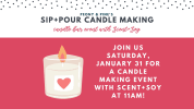 Join us Saturday, January 31, for a candle-making event with Scent+Soy at 11am! A light snack and mocktails will be provided! Sign up here: https://tinyurl.com/muu6rz6d