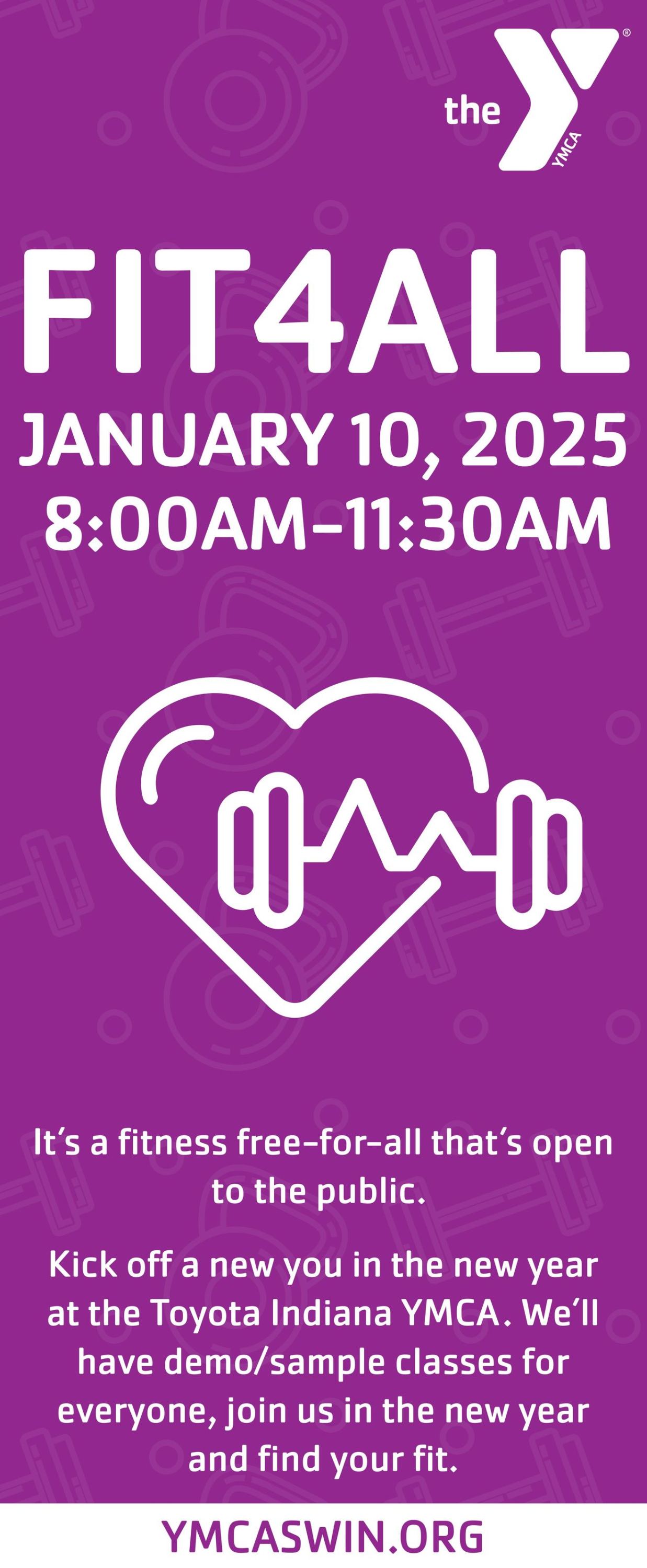 Kick off the new year with FIT4ALL! 💪 Join us January 10 | 8:00–11:30 AM at the Toyota Indiana YMCA for a fitness free-for-all open to the public. ✨ Try demo/sample classes ✨ Explore new workouts ✨ Find what fits YOU No pressure—just fun, movement, and motivation. Bring a friend and start 2025 strong!