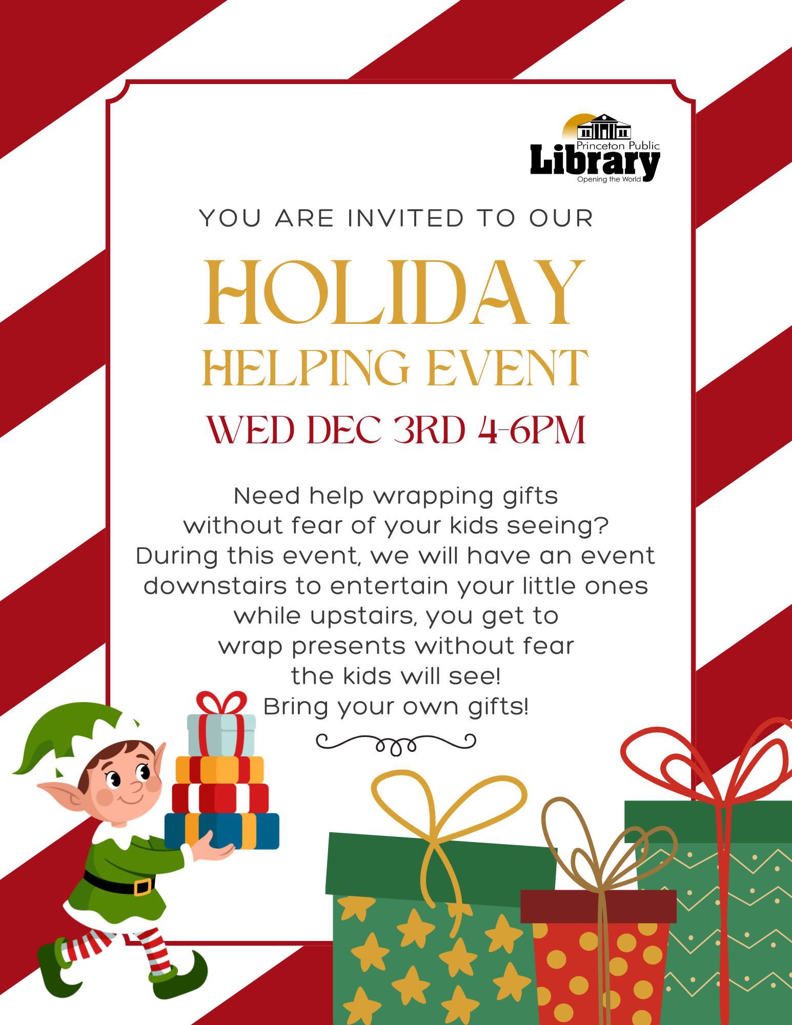 Just don’t have the time to get those gifts wrapped AWAY from watchful eyes of the kiddos? Have no fear! Your local library here is here! We will offer 2 hours of our evening on December 3rd for you to come in, drop your littles downstairs with our fun Youth Team while upstairs you and our helpful staff members get those gifts covered! This a free to attend opportunity! We will be providing as much supplies as we can, but if you’d also like to bring in your own along with your gifts, that’s fine too!