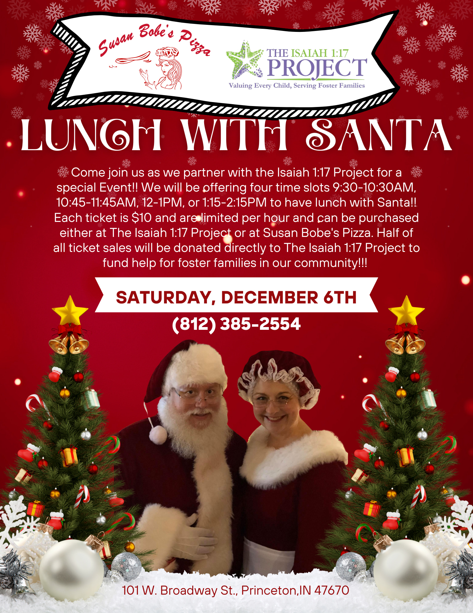 Come join us as we partner with the Isaiah 1:17 Project for a special event! We will be offering four time slots, 9:30-10:30AM, 10:45-11:45AM, 12-1PM, and 1:15-2:15PM to have lunch with Santa! Each ticket is $10 and are limited per hour and can be purchased either at The Isaiah 1:17 Project or at Susan Bobe's Pizza. Half of all ticket sales will be donated directly to The Isaiah 1:17 Project to fund help for foster families in our community!Images