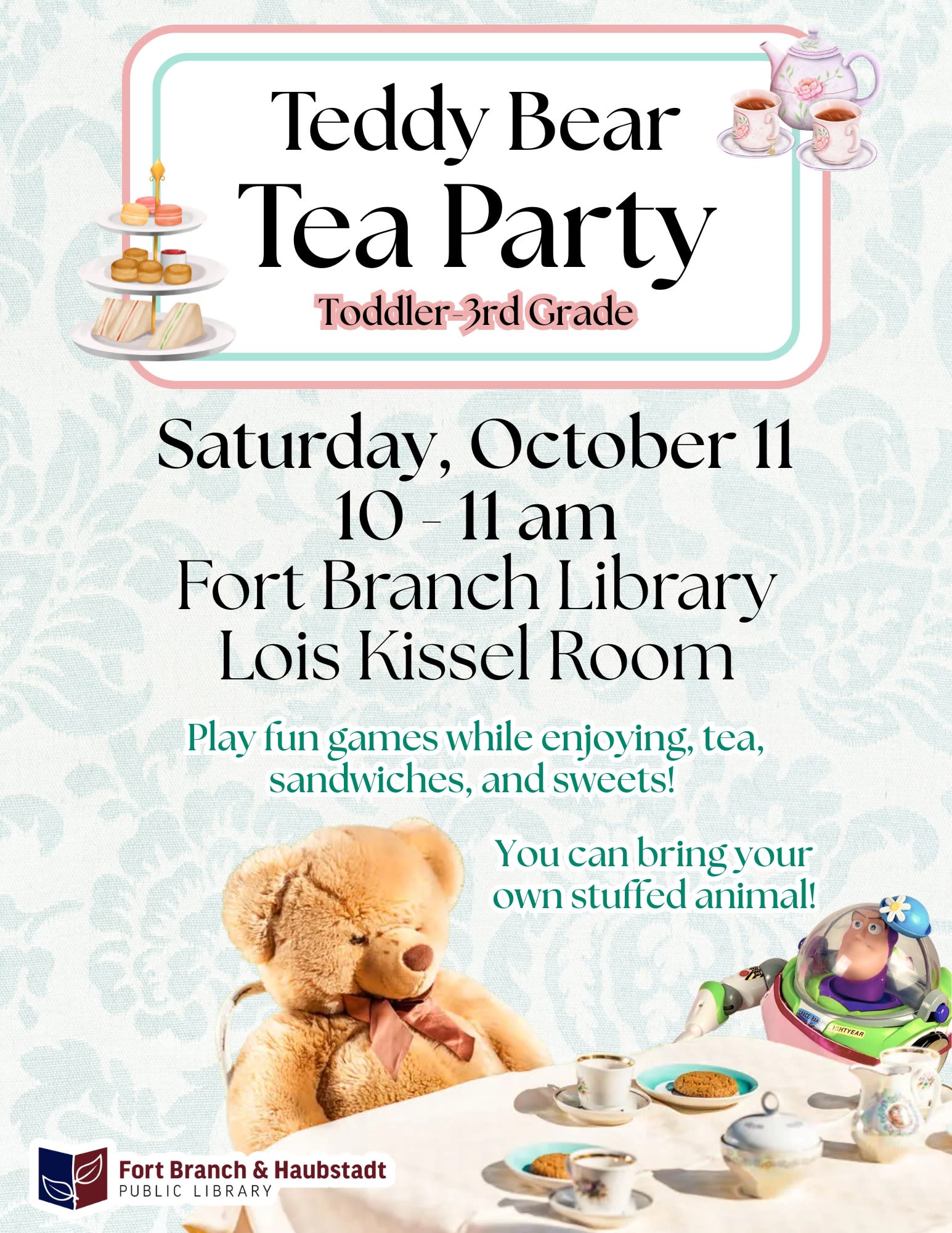 Join us at Fort Branch Library for this FREE program for ages toddler-3rd grade. Kids can bring their own stuffed animal/toy to have a tea party with! We will have games, snacks, and take fun photos!