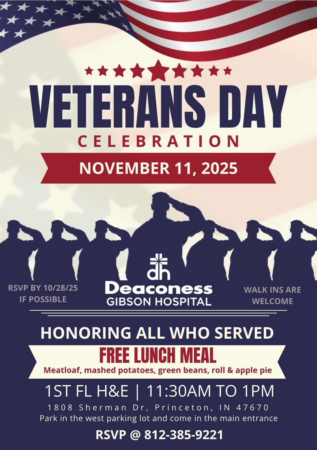 Join us for a free meal for all veterans at Deaconess Gibson Hospital. RSVP if possible at 812-385-9221. Park in the west lot and come in the main entrance.